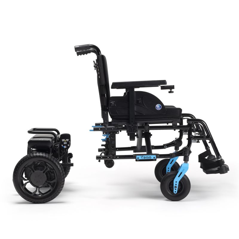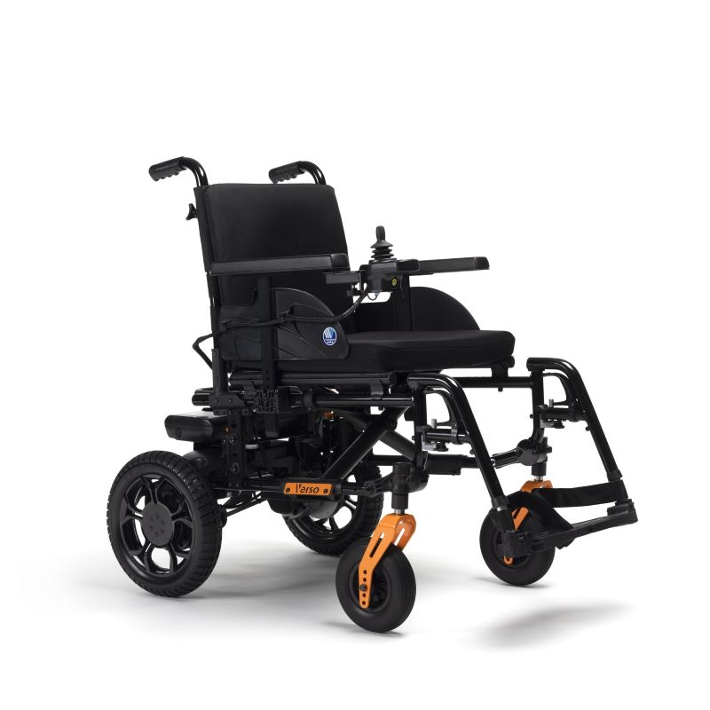 A Verso é uma cadeira de rodas elétrica versátil e ágil. Desmontável para facilitar o transporte. Comando à direita, Encosto em nylon ajustável em tensão, Almofada em tecido 3D, Cinto com fivela rápida, Altura de assento 50 cm, Punhos reguláveis em altura, Barra de empurrar. Apoio de braços ajustáveis em altura e extraíveis, Apoio de pés abatíveis e extraíveis, Fita de suporte de calcanhar, Roda dianteira 200X50 Preta, Roda traseira 12″ PU preta.